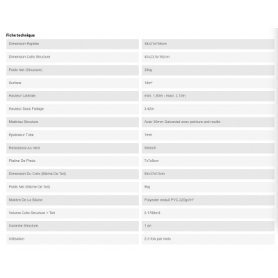 • Comprend la structure, la bâche de toit, 3 bâches pleines et une bâche porte zippée.