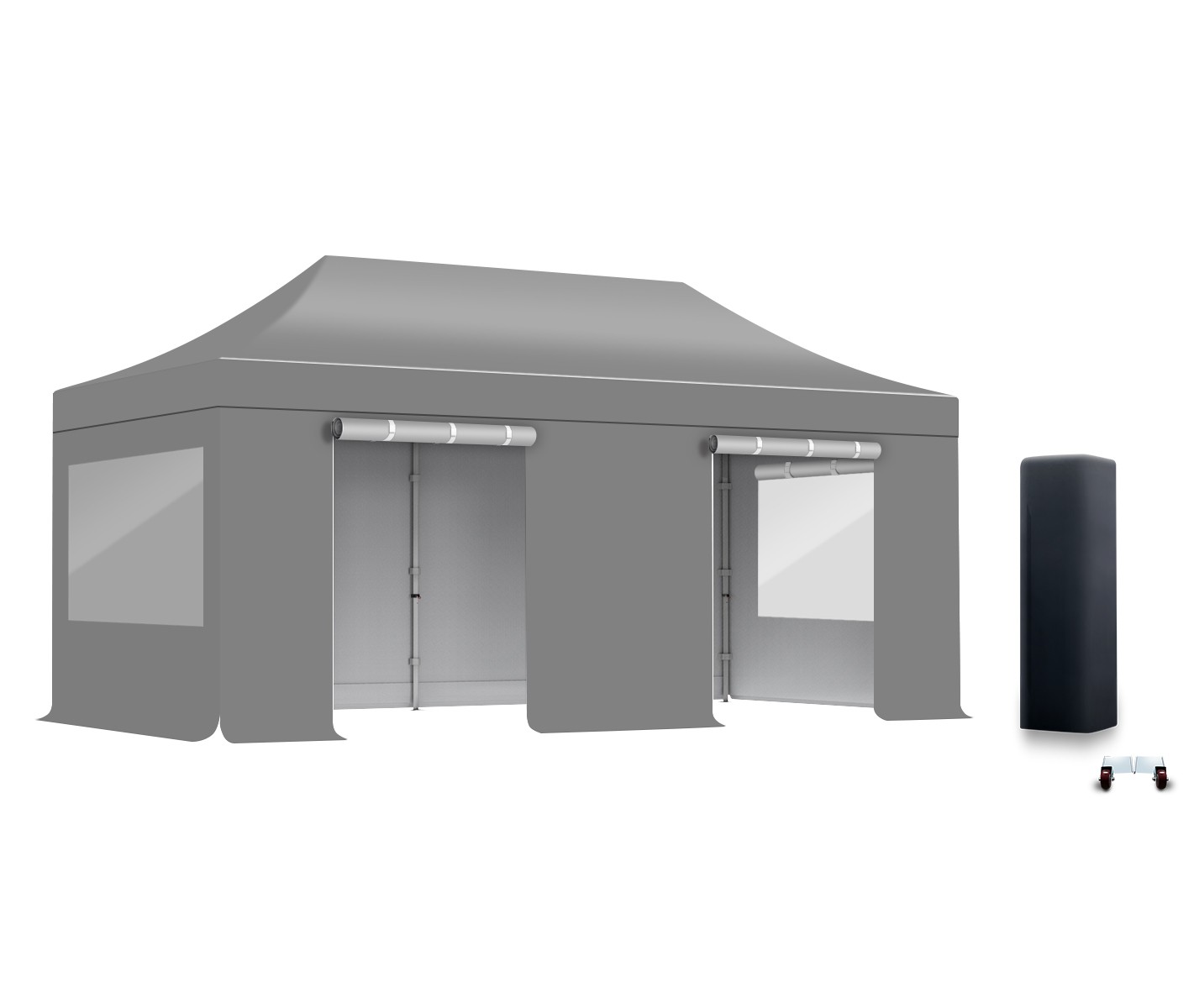 Les bâches latérales de ce pack complet sont composées de 2 murs fenêtres panoramiques avec rideaux, 1 bâche pleine et 1 porte en 380g/m² polyester PVC.