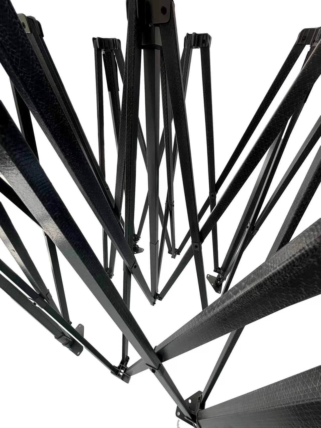 Cette tente robuste peut être utilisée de manière fréquente, plusieurs fois par semaine, que ce soit dans le cadre d'une foire, d'une activité professionnelle sur les marchés, ou lors d'événements. Son armature solide en fibres de verre renforcé, présente une structure hexagonale et une épaisseur de 2,6 mm et garantit une protection contre la corrosion grâce à sa robustesse exceptionnelle, assurant une stabilité accrue face au vent.