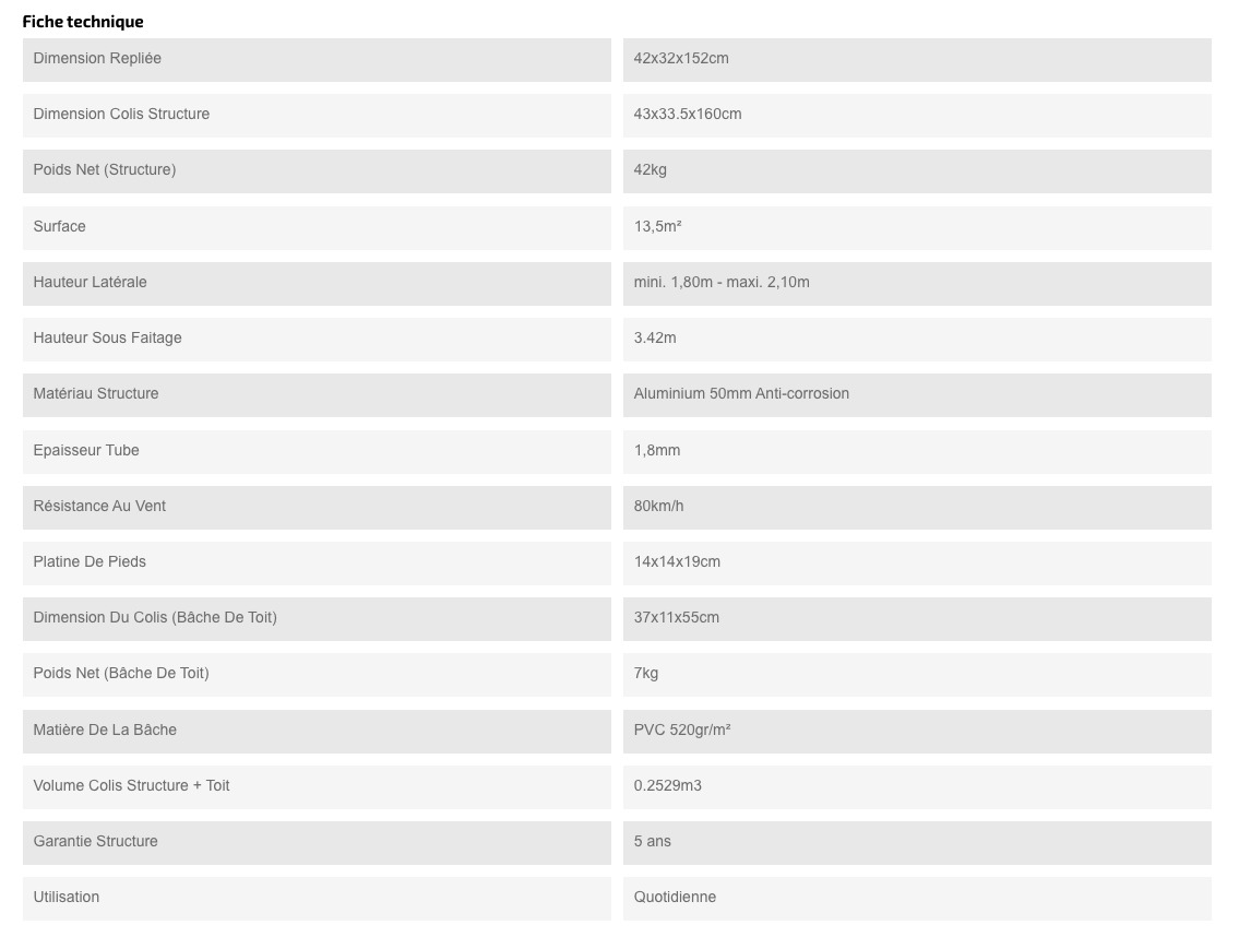 ▪ Les tubes en aluminium 55mm offrent à votre tente la plus grande solidité possible. Vous aurez la possibilité d’opter pour nos modèles de bâches en 380g/m² et 450g/m²polyester enduit PVC, ou bien nos bâches ultra-résistantes 520g/m² 100% PVC. Leur résistance au vent est de 70-80 km/h.