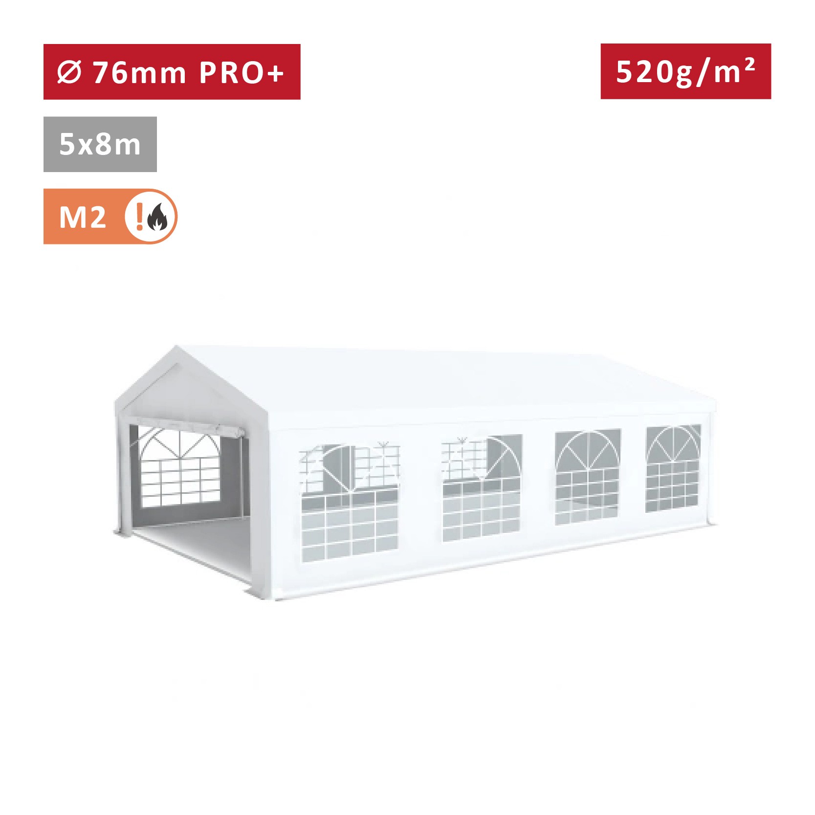 Tente Barnum Pro+ 5x8m, PVC 520g/m², tubes 76mm, blanc ignifugé M2